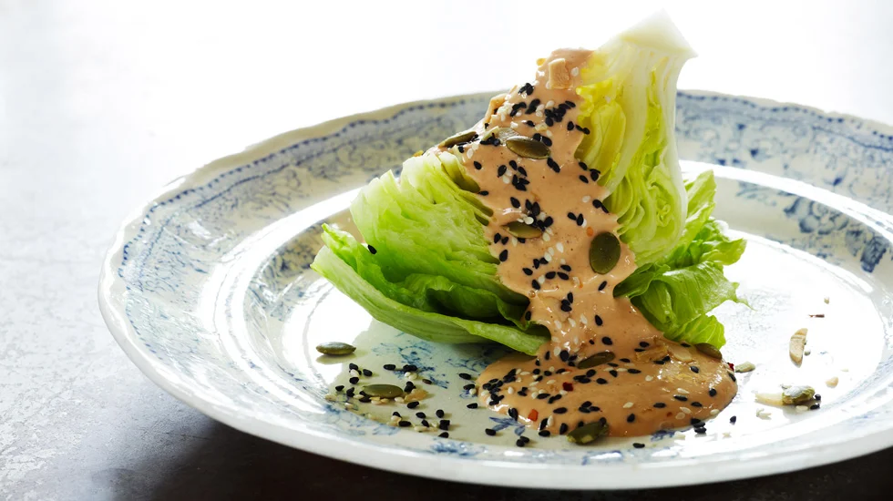 - Remove and discard the outer leaves from the lettuce and cut it into 4 wedges. Place a wedge on each plate and spoon the dressing across the middle of the wedge, leaving the points free. Scatter with mixed seeds or furikake and ideally serve with crusty garlic bread.