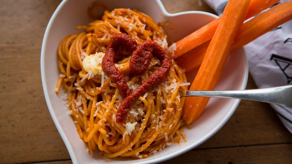 - Drain, retaining a small amount of the cooking liqueur. Pour the spaghetti back into the pan and add the Bomba, butter and Parmesan cheese. Stir until well combined then serve in bowls each with a Bomba kiss or heart on top.