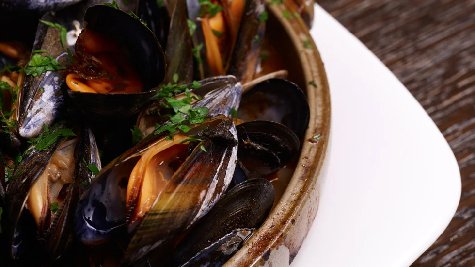 - Place the mussels and juice in a serving dish and sprinkle with chopped parsley or chives.