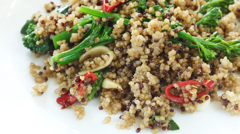 - When sizzling, add the quinoa and broccoli and continue to stir-fry until the broccoli begins to become tender.
