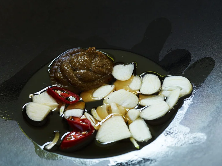 - Heat the sesame oil in a large non-stick pan, add the garlic, ginger and umami paste.